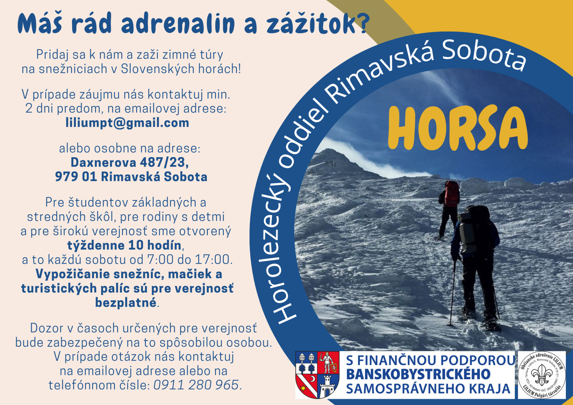 Občianske združenie LILIUM si stanovilo za cieľ založiť si horolezecký oddiel v meste Rimavská Sobota, hlavne pre študentov z Rimavskej Soboty, ale takisto aj pre rodiny s deťmi, aby si mohli zmysluplne prežívať svoj voľný čas a vyskúšať si rekreačné, voľnočasové športy tohto charakteru. Kúpou horolezeckého vybavenia sme chceli docieliť, aby mládež a rodiny s deťmi si mohli tieto rekreačné, voľnočasové športy precvičovať a realizovať v zimných mesiacoch pomocou bezpečnej, modernej a kvalitnej športovej výbavy, a taktiež aby si náš novovznikajúci horolezecký oddiel bol zabezpečený, z hľadiska športovej výbavy a športovo-technického vybavenie. V spolupráci so skautmi, s dorastencami, s rodinami s deťmi, so základnými a strednými školami mesta Rimavská Sobota v minulosti sme zorganizovali už mnoho podujatí, kde sa využívala horolezecká technika - zľaňovanie hradných múrov, prírodných skál, roklín, či jaskýň, lezenie po skalách či po ľadopádoch - ale neboli sme vybavení s vhodnou technikou na vysokohorskú turistiku v zimných mesiacoch.